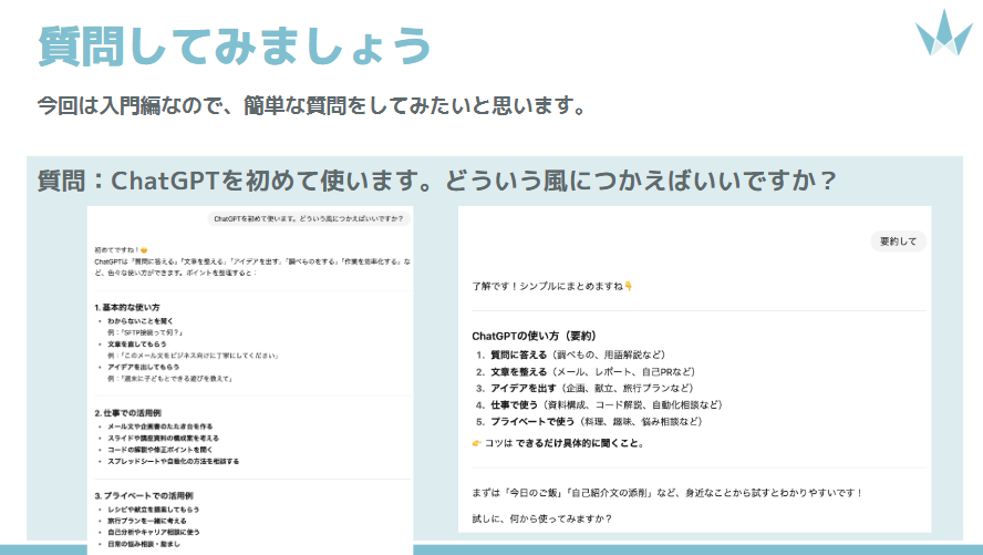 このセミナーでは、日常生活や仕事での活用方法を実際にChatGPTと会話している画面を見ながら一緒に体験できます。